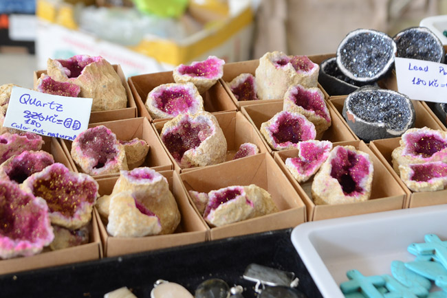 Vlevo krásně dobarvené křemenné geody, vpravo uměle vyrobené geody vyplněné drceným galenitem. Tyto alespoň byly označené jako uměle upravené, někteří prodejci však měli podobné perly a vydávali to za přírodní minerály.