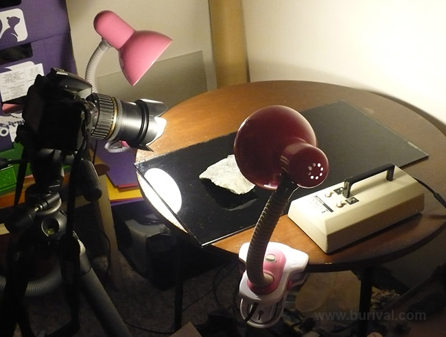 Jednoduchá sestava pro focení na černém pozadí. Jako podklad slouží černé sklo, vzorek je nasvícen dvěma lampičkami s úspornou žárovkou 15 W. V případě potřeby lze ještě sestavu doplnit odraznou deskou. Fotoaparát je na stativu, nastavení je na prioritu clony pro dosažení maximální hloubky ostrosti. Na objektivu je polarizační filtr a sluneční clona, aby nevznikaly zbytečné odlesky.