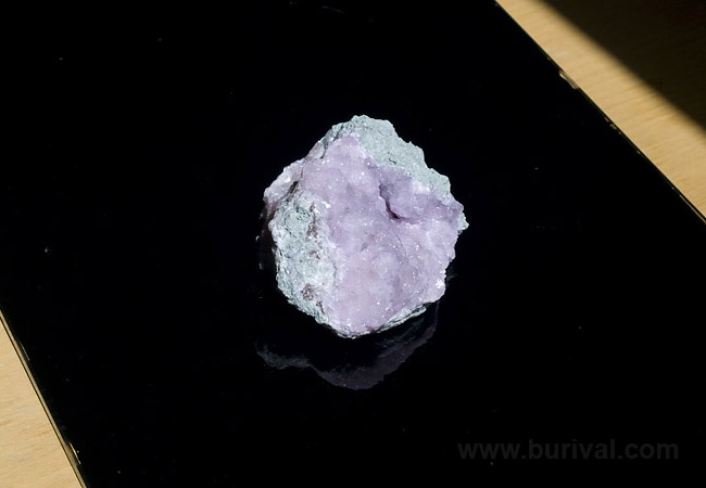 Jednoduchý příklad fotografování na černém pozadí. Jako podklad slouží černé sklo, vzorek je nasvícen přímým slunečním světlem.