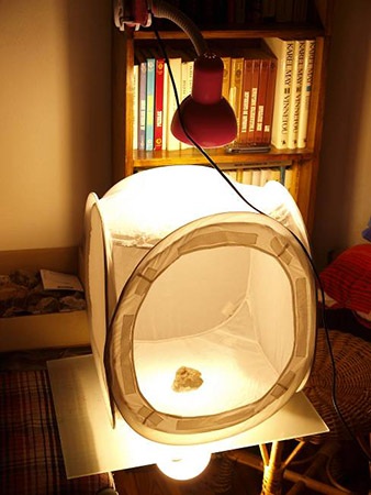 Je několik situací, kdy je světelný stan problém. Obvykle se v něm velmi těžko fotí bílé anebo čiré vzorky. Bílé vzorky splývají s pozadím a čiré ztrácí hloubku a nevyniknou. obojí je lepší fotit na barevném pozadí, které si probereme někdy příště. Ke stanům se obvykle dodávají i barevná pozadí, jenže na minerály se bohužel příliš nehodí kvůli zřetelné textuře.