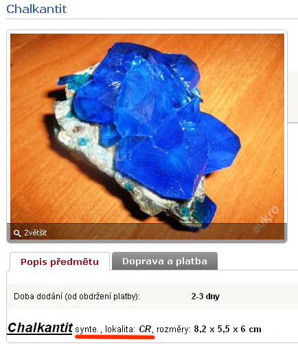 Syntetický chalkantit, povšimněte si matoucího označení lokality